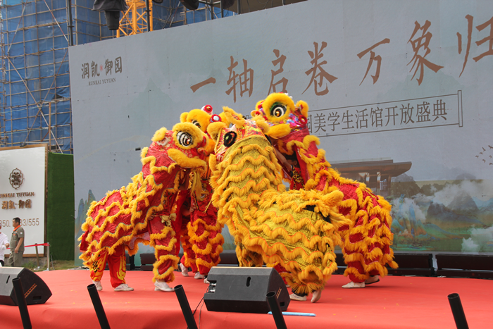 在中国民俗中,“点睛” 寓意赋予生命与希望。四头醒狮蓄势待发,项目领导持朱砂笔为润凯御园美学生活馆点睛纳福。