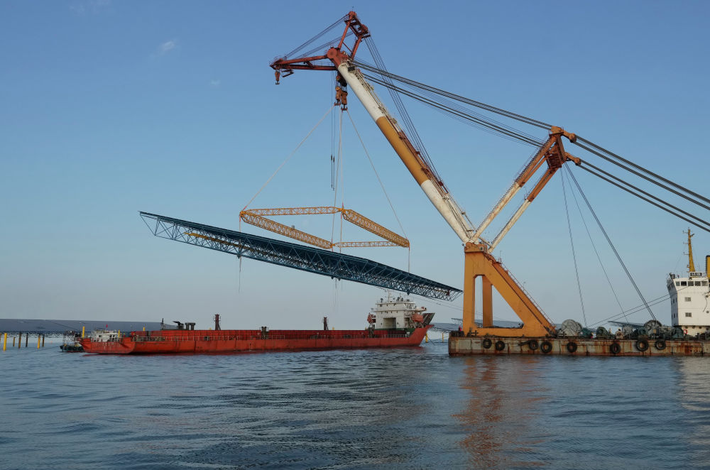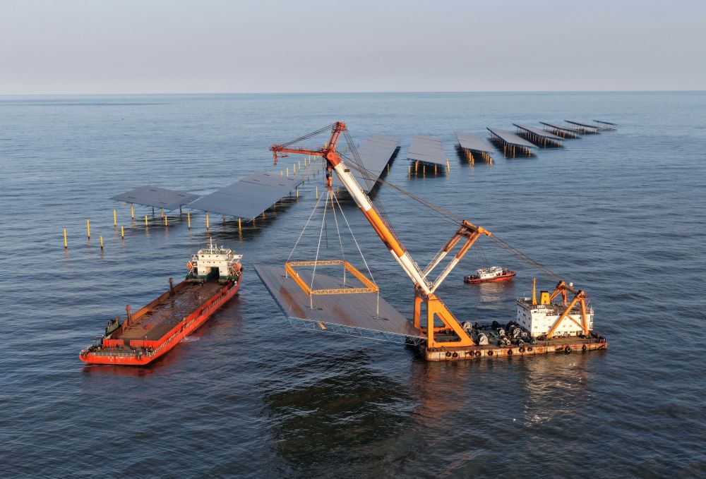 ↑12月24日,工人在位于河北省昌黎县海域的海上光伏电站试点项目建设工地操作机械设备作业。