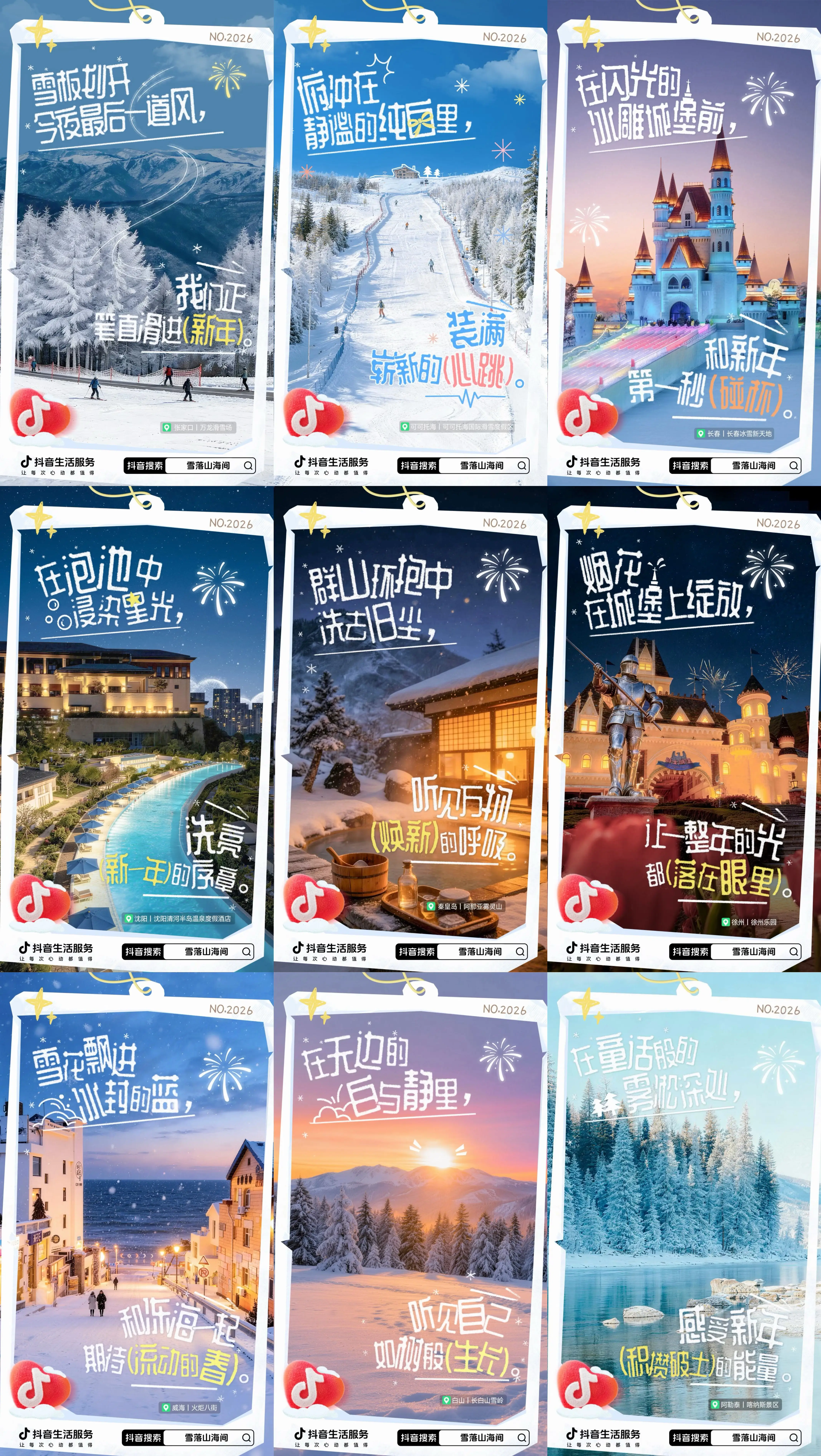 为承接用户强烈的跨年情感需求,抖音生活服务通过一套层次丰富的线上内容矩阵提前蓄势。一系列节日情绪海报精准释出,在站内营造出浓厚的节日氛围。针对滑雪、温泉、乐园、亲子等核心冰雪消费场景,抖音生活服务定制了多款品类主题海报,以极具故事感和氛围感的视觉设计,直观展现不同场景下的跨年特色,提前唤醒其对特定场景的向往。